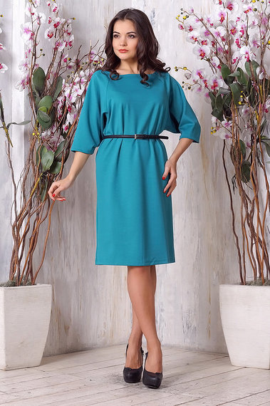 Красивое платье прямого кроя, с рукавами 3/4. Модель бирюзового цвета, длиной до колен, на поясе платье можно прихватить ремнем, который входит в стоимость изделия.