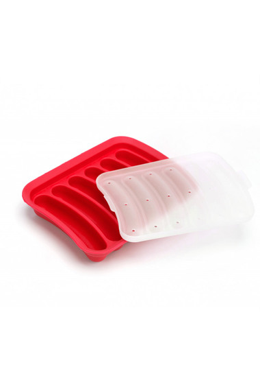 Смажьте форму маслом. Приготовьте фарш. При желании добавьте специи, панировочные сухари, лук, яйцо, сыр или бекон. Заполните фаршем углубления для сосисок. Накройте крышкой. Запекайте в духовке или микроволновой печи до готовности. Готовые сосиски положите в форму и запекайте до готовности. Рекомендации по уходу: Помыть после использования. Можно мыть в посудомоечной машине. Не использовать абразивы, металлические щетки и губки.
